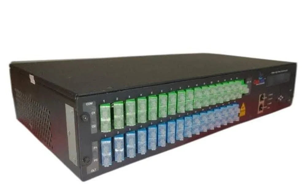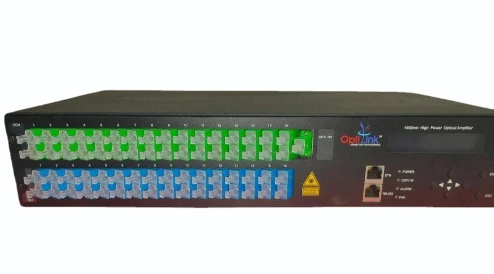 The Optilink 16 Port PON EDFA WDM Dual SMPS is a high-performance optical amplifier designed for FTTH and CATV networks. It features 16 output ports, each delivering 19 dBm of optical power, with a total output of 38 dBm. The device operates within the 1530–1565 nm wavelength range and incorporates a built-in WDM (Wavelength Division Multiplexing) to combine CATV and PON signals efficiently. Equipped with dual SMPS (Switched-Mode Power Supply)for redundancy, it ensures continuous operation. The amplifier also supports SNMP-based network management and boasts a low noise figure of ≤6 dB, making it suitable for large-scale fiber networks.